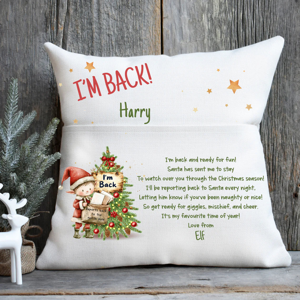 “I'm Back” Christmas Pillow – Custom Elf Pocket Cushion