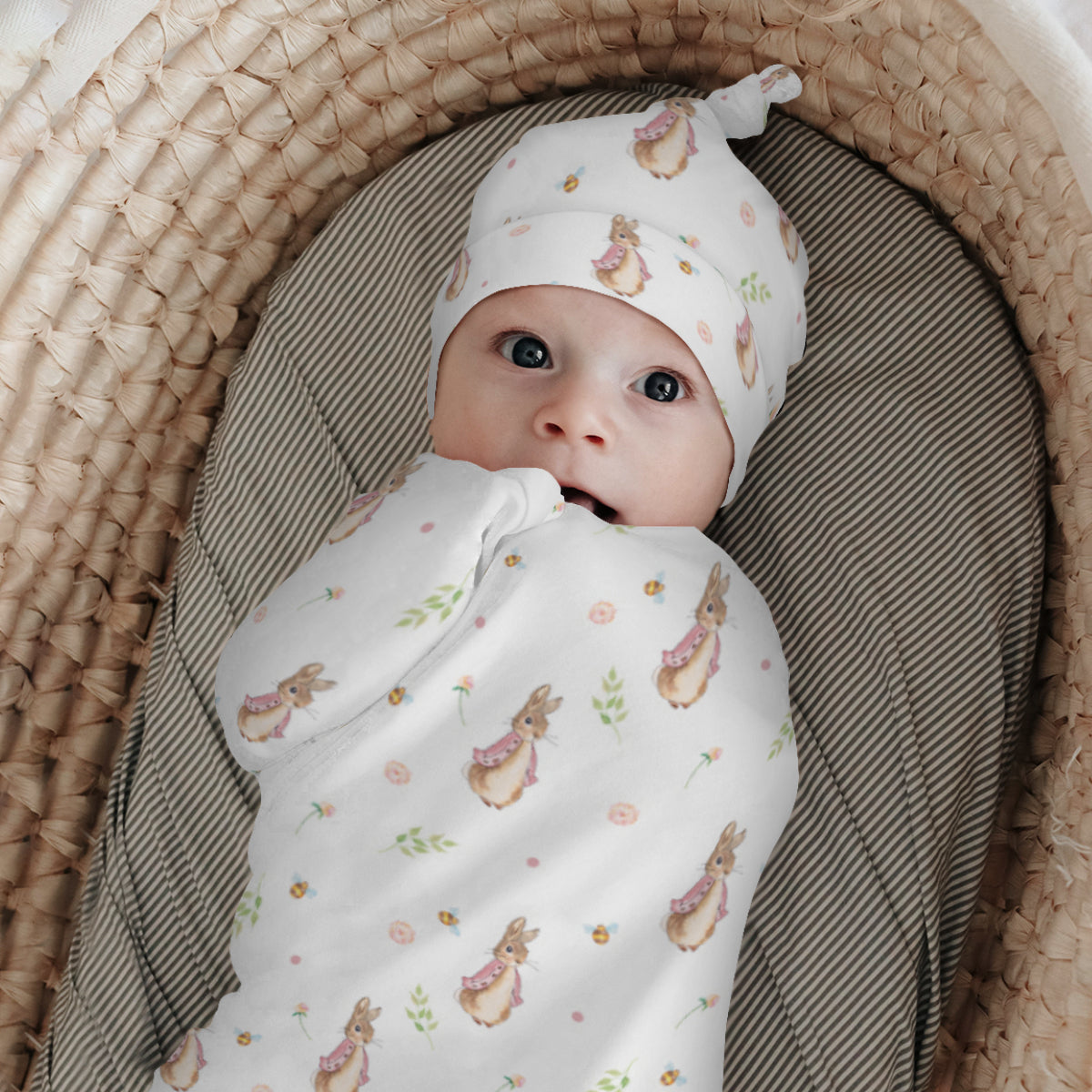 Our Flopsy Baby Swaddle & Beanie Set is thoughtfully made from a soft, stretchy blend of 95% polyester and 5% spandex, designed to be gentle on delicate newborn skin while providing warmth, comfort, and breathability.